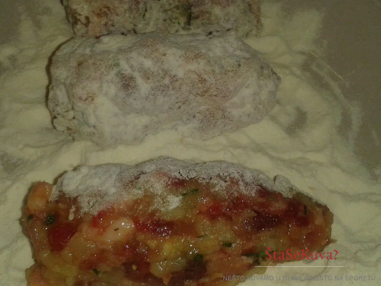 Krompir skuvati, ohladiti, pa ga izrendati (najlepše mi je kad krompir kuvam u ljusci, zadrži više hranjivih sastojaka, a i lepše se renda). Crni i beli luk sitno naseckati. Mleveno meso (ja uzmem 100 g svinjskog + 200 g junećeg) sjediniti sa rendanim krompirom, sitno sečenim crnim i belim lukom, peršunovim lišćem (može, a i ne mora ako ne volite) i žumancima.
