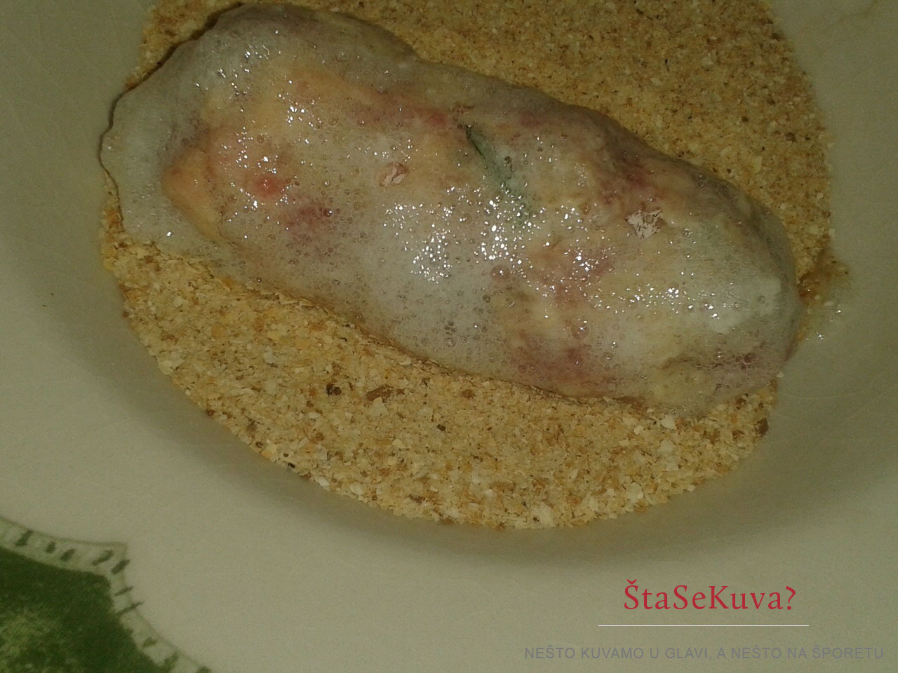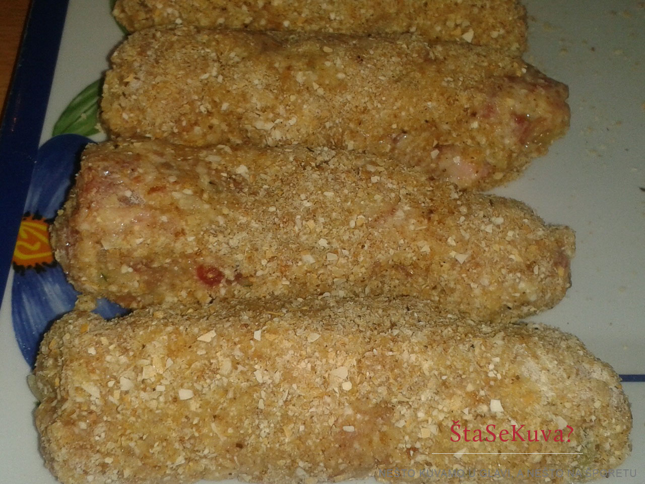 Oblikovati ćevape tako da budu malo deblji. Svaki ćevap prvo uvaljati u brašno, potom umočiti u prethodno umućena belanca i na kraju uvaljati u prezle.