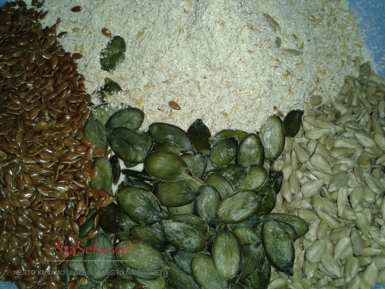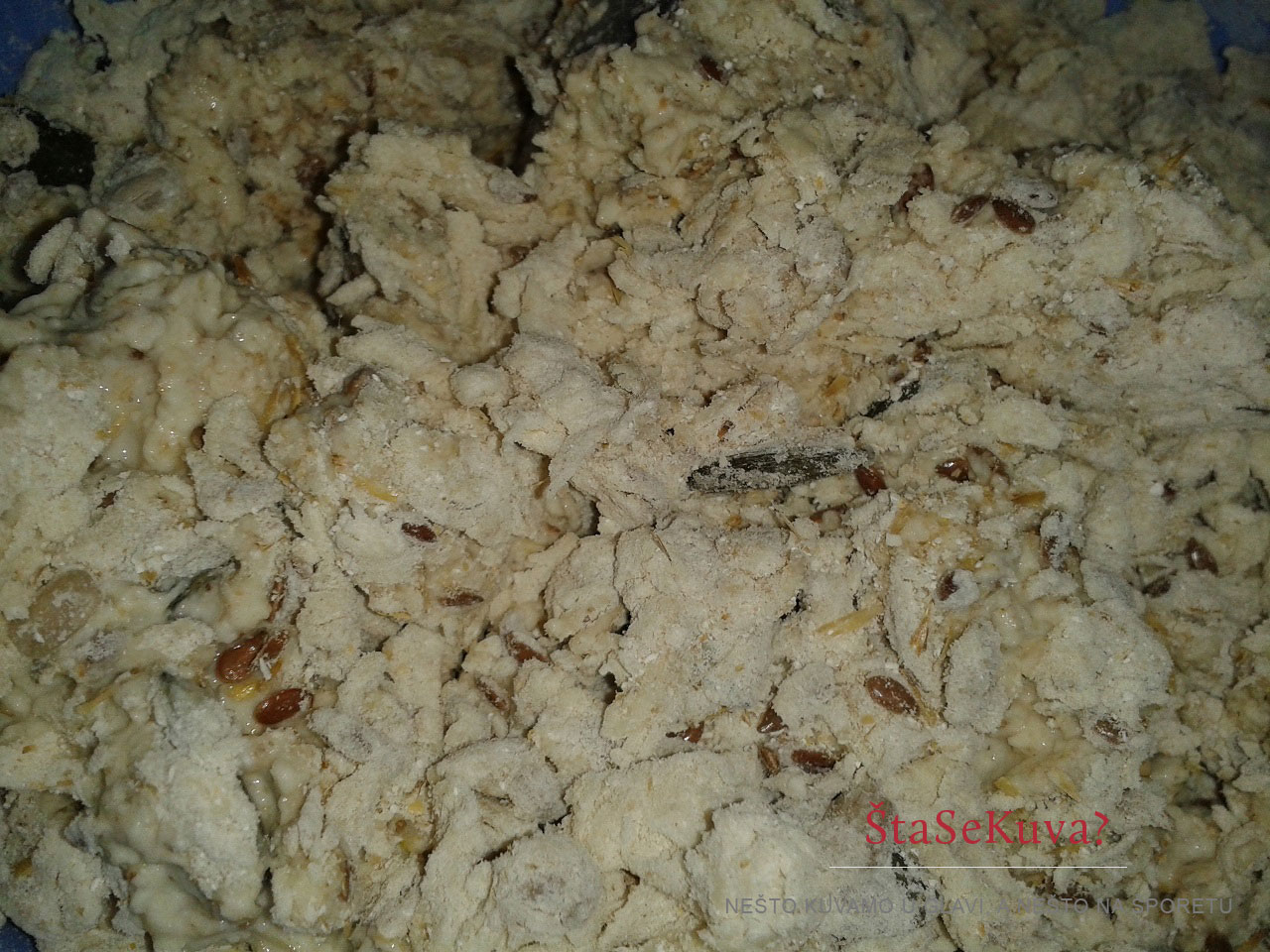 Sjediniti suve sastojke (brašno, so, soda bikarbona i semenke), a potom dodati tečne (jogurt, vodu i ulje). Sve izmešati da se dobije kompakna smeša koju možete da mesite na radnoj ploči.