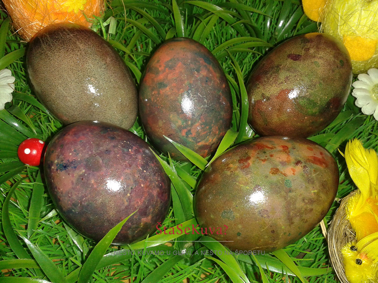 Ako ste se kojim slučajem zapitali kako je to meni uspelo, evo pogledajte sami. Obarila sam obična kokošija jaja, nisam im izbeljivala ljusku i koristila sam standardne boje za farbanje jaja.