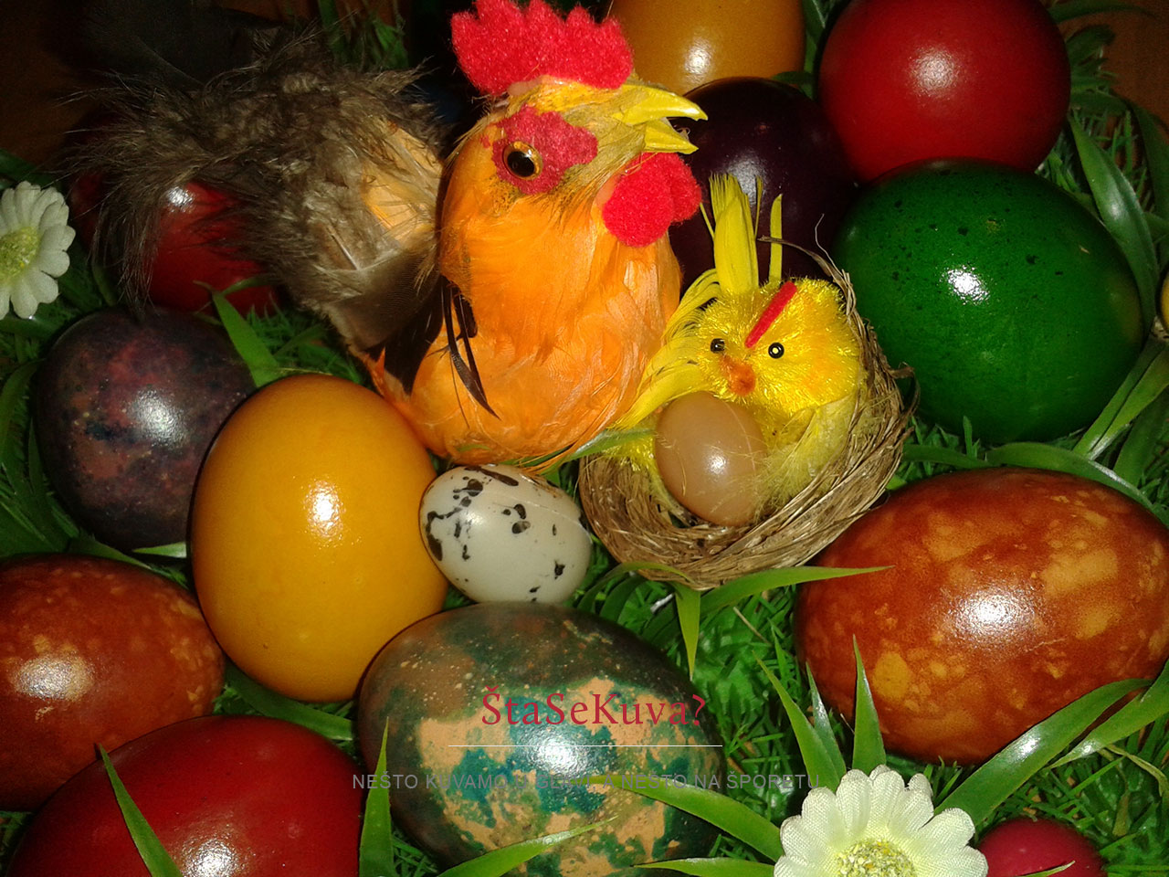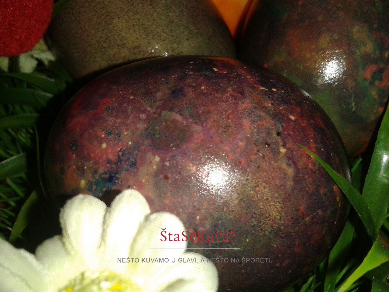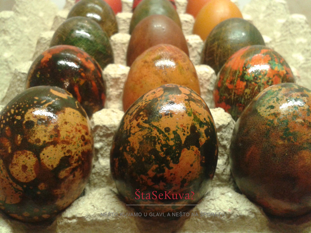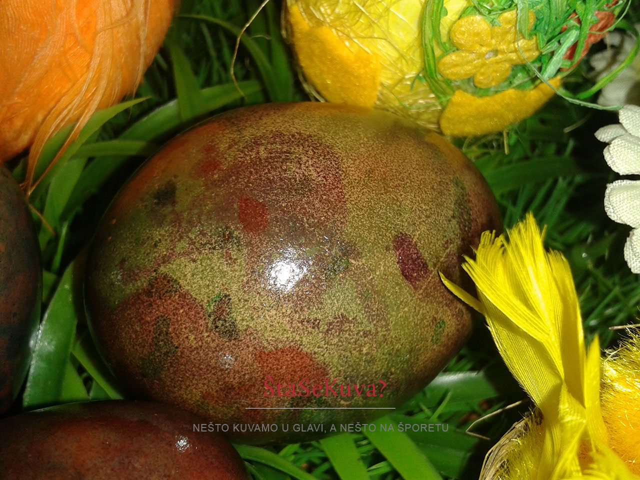 Što bi rekla jedna čuvena voditeljka iliti voditeljica, citiram: “NE! NIKAKO!!!” Mislim, toliko sam se iznervirala, da sam čak i negde, u nekoj fb grupi ostavila komentar da bih pre koristila decoupage tehniku sa salvetama i belancima nego ovo sa lakom za nokte… Alo ljudi, mućnite glavom, pa to jaje posle treba da se jede… Inače, i taj dekupaž (decoupage), malo mi dosadio, mislim, preteraše ga i sa tom tehnikom i sa tim jajima, zatrpan net i fb ovih dana, a ja baš onda neću tako… 🙂