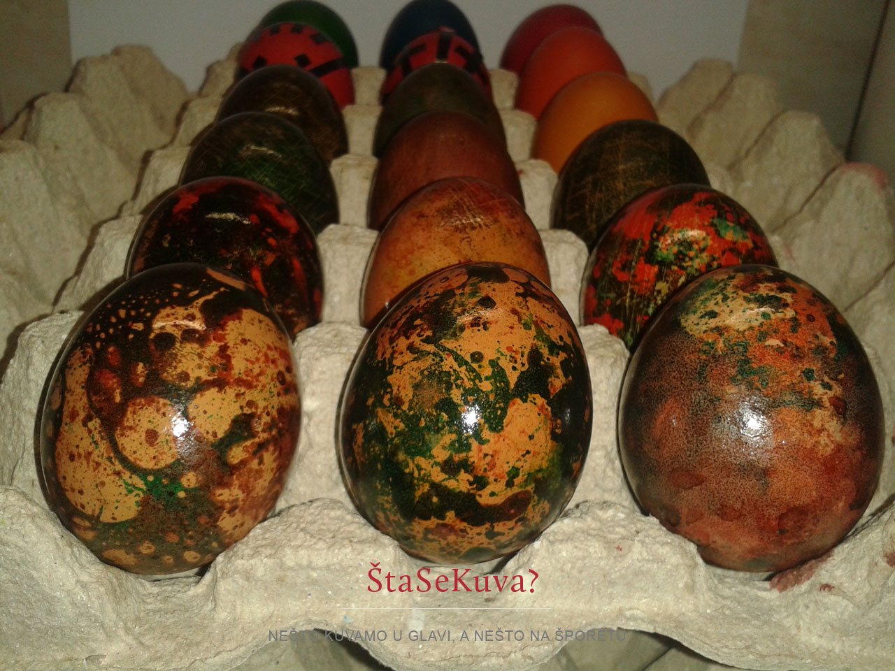 Meni se ovo jako dopada i ove godine ću jaja sigurno farbati baš ovako. Ukoliko vam je ova tehnika suviše jednostavna, potražite na internetu i primenite neku od, rekla bih milion, najrazličitijih tehnika farbanja jaja… Što bi rekli, ko voli, nek izvoli… ja sam ipak za klasiku, uz varijacije na temu 🙂