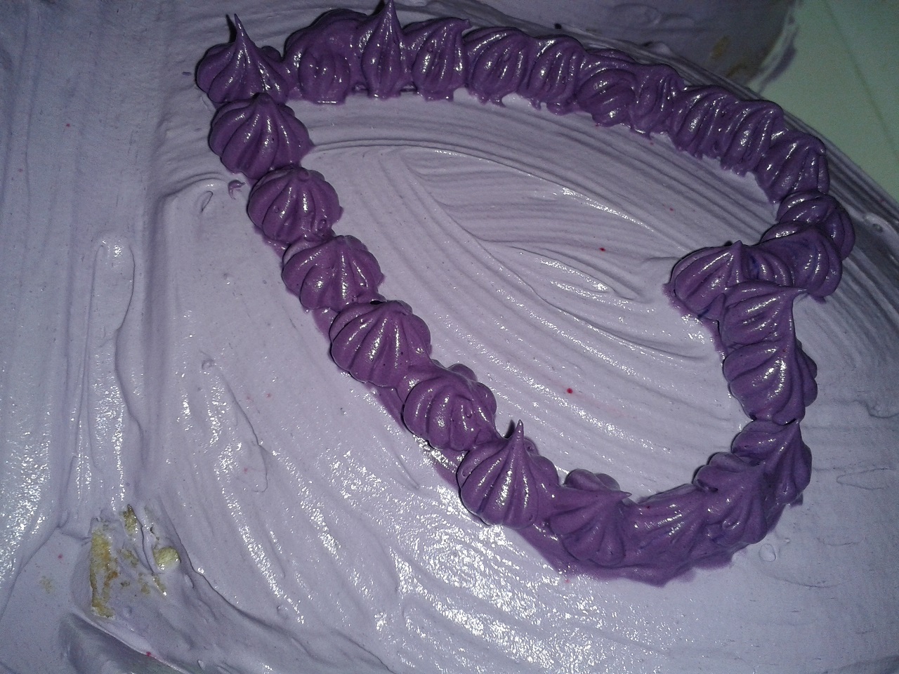 Prvi sloj šlaga napravila sam u nežnoj lila boji i prekrila celu tortu. Nakon toga poslastičarskom kesom sam pravila pufnice u ljubičastoj boji.