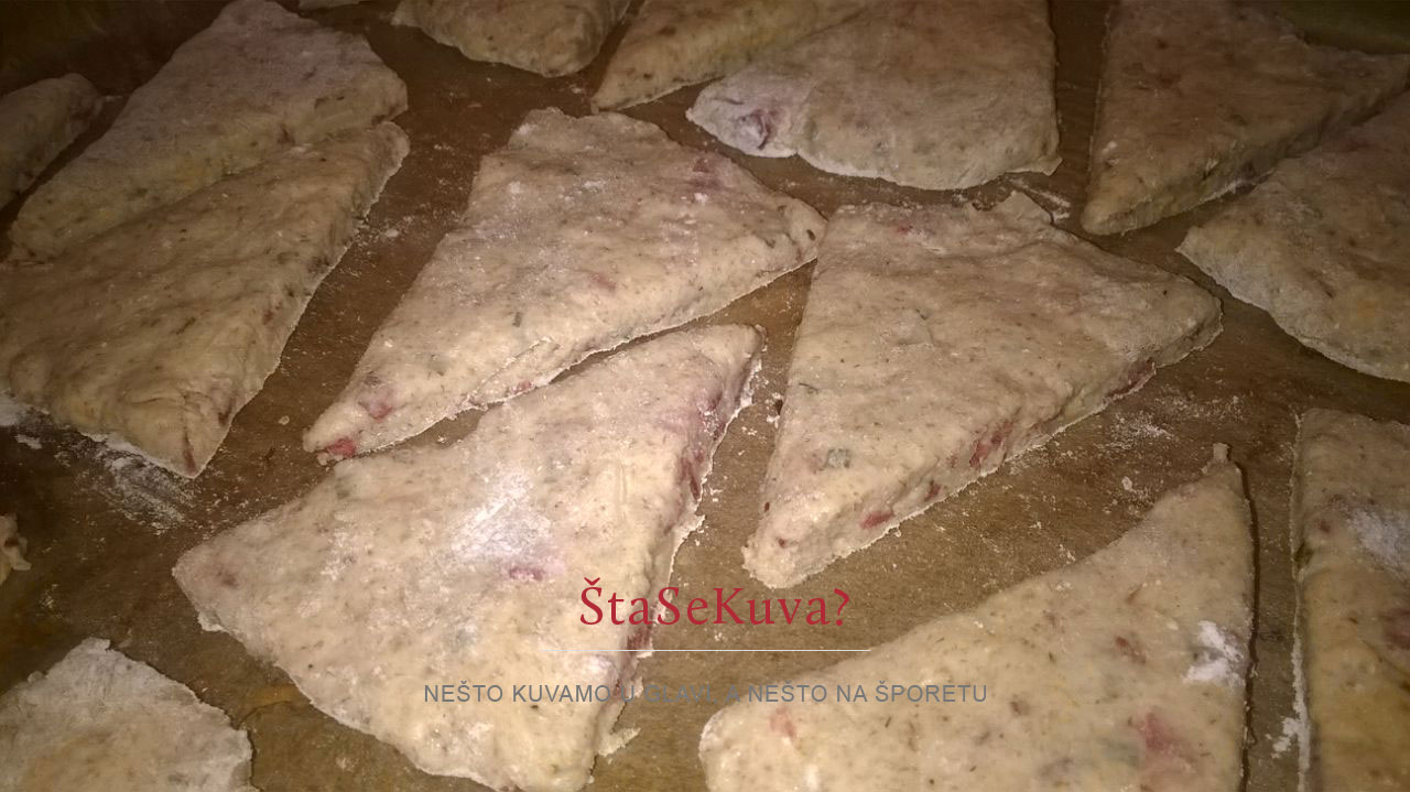 U odgovarajućoj posudi za mešenje pomešati suve sastojke (sve vrste brašna, so, sveže mleveni biber i prašak za pecivo). Hladan maslac naseći na listiće ili narendati na krupno rende, pa prstima umešati u brašno dok se potpuno ne izgubi u njemu. Dodati sitan sir (švapski sir, sir za pite ili mrvljeni feta sir) pa umešati u brašno. Ukoliko želite, u brašno možete dodati i malo začina po ukusu (origano, vlašac), seckani kulen i tvrdi sir.