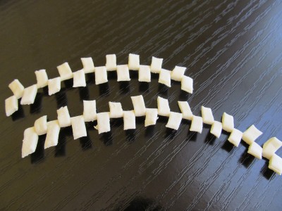 Prvo uzmite malo testa i rastanjite ga izmedju dlanova tako da dobijete jedan tanak valjak (traku) debljine oko 2mm a dužine 10-15cm, zatim napravite još jedan kratki valjak dužine oko 2cm. Zatim napravite oko 20 malih kuglica razne veličine i sastavite grozd. Oko jednog kraja dužeg valjka zalepite sa malo vode dva reda kuglica po 4 sa svake strane, zatim sa jedne strane kuglica zalepite kratki valjak da na njega možete da dodate još jedan red kuglica, a zatim odozgo popunite kuglicama mesta tako da dobijete bogat grozd. Dužu traku spiralno uvite tako da obrazuje peteljku.